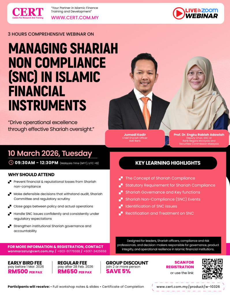 Come join us in our 3-hour comprehensive webinar on Managing Shariah Non-Compliance (SNC) in Islamic Financial Instruments is a training session organized by the Centre for Research and Training (CERT)