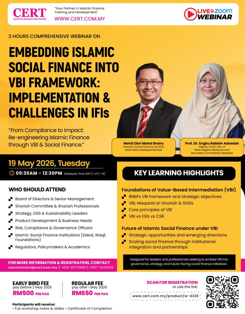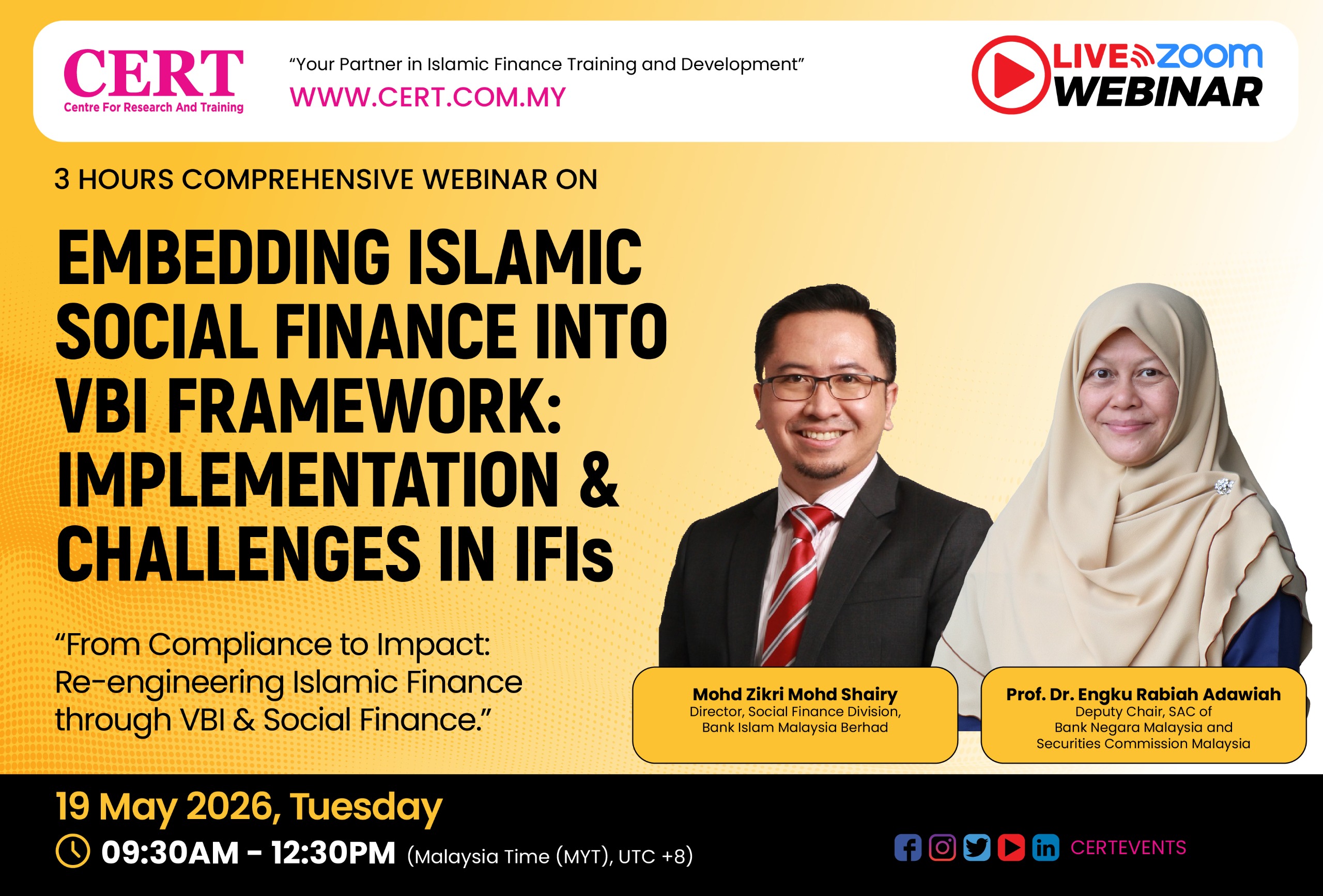 The 3-hour comprehensive webinar on “Embedding Islamic Social Finance into VBI Framework: Implementation & Challenges in IFIs” is organized by the Centre for Research and Training (CERT).